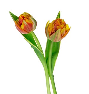 Additional notes: Tulips are very phototropic and will curve rapidly toward the light. Designers must allow for this in creating a floral design as well as the fact that cut tulips continue to grow in length approximately one inch per day. The name tulip comes from the Turkish for turban, referring to the shape of the flower bud; although native to that area of the world, tulips are now grown throughout the world. Many people associate them with Holland: "Tulips from Amsterdam," as the song goes. But even before a European envoy found them in the ornamental gardens of a Turkish sultan, they were popular with the Indian shahs. They were originally native to Turkey, Iran, Syria and parts of Asia and have been cultivated in Europe since the 16th century. It was the Dutch who began to breed them in 1593 and by 1633 the Dutch upper classes were gripped by "Tulip Mania," the frenzied trading in tulip bulbs. Prized tulip bulbs were selling for astronomical prices. Fortunes were made in trading tulip futures (primarily by tulip bulb merchants), and fortunes were lost. As in so many "hot stock markets" (dot.com comes to mind), buyers eventually realized that a tulip bulb was just a tulip bulb. There is an enormous range of colors and shapes, from double tulips, which resemble roses, to lily-flowered ones with elegant pointed petals and the wonderful fringed or contorted two- or three-toned parrot tulips. Research has shown that people see tulips as sophisticated and stylish. They like them to curve towards the light, for tulips continue to grow strongly after cutting. Some like them bold and upright and, for this, a light source above the flower heads will do the trick. Certainly, their strong form suits modern interiors very well and mixed with other flowers, they bring focus to informal and hand-tied bouquets. The tulip never goes out of fashion; it is merely displayed in different ways in different eras.
