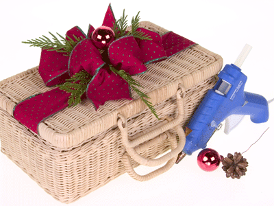 Using a hot glue gun, adorn the ribbon with bits of evergreen foliage (fresh or faux, both work well), a few pine cones and a Christmas ball or two. If you are not an accomplished bow maker, never fear! Every bow looks great once you glue in the Christmas accents.