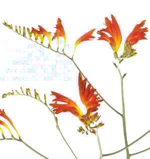 Additional notes: Rich orange tube-shaped flowers pertly arranged around a central axis; little clusters of flowers that branch out into a typical freesia-like flower-spike - this architectural structure gives the Crocosmia a character of its own. Anyone with a good nose will also be able to make out the flower's modest, but highly specific saffron scent. The name crocosmia contains the Latin croceus (saffron-colored). The Crocus sativus is the source of our culinary saffron. Not only does the flower smell of saffron, but it has the spice's deep rich golden-tan color too. The flower's color is also reminiscent of its country of origin, South Africa, conjuring up sun-baked savannahs, dusty red roads, and warm sandy beaches. South Africa is also where the more common freesia, Gerbera and gladiolus originated. Perhaps crocosmia will become as familiar and as popular as these flowers. With their fiery yellow, orange, red and tan colors they will create a sparkling network of Indian summer lights in any bouquet.