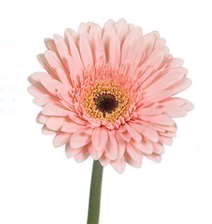 Additional notes: Gerberas are sensitive to fluoride. Fluoridated water can cause petal tip burn. If flowers are properly conditioned, bent necks should not occur. If a bent neck does occur it is probably the result of clogged stems due to dirty vase water. Gerberas are very heavy water drinkers and will last longer in vase water than in floral foam. There are currently over 300 different varieties of Gerbera grown for the floristry market. When the Gerbera was imported into Europe from South Africa in the 19th century, few people would have suspected the flower would become so popular. Gerberas are now widely in demand as cut flowers. With over 300 varieties, Gerberas offer an almost incredibly wide range of colors. Every color except blue is represented. The bright colors automatically make one think of tropical sun. Pink and orange go so well with the feelings evoked by late summer and autumn. There are also Gerberas in pale pastel colors; and those with a more classical taste can choose from a wide range of reds. For the more style-minded, black-and-white contrasts are even represented in a single flower: there are pure white Gerberas with a black heart. A new color trend, coffee and cream, is currently very popular in interior design, and the beige, cream and fleshy pink tones of certain Gerberas coordinate beautifully. Gerberas also have a very trendy shape. Being uncomplicated single flowers on stems, they are entirely in line with the current minimalist, “back-to-basics” trend. Ask any child to draw a flower and nine out of ten will produce a brightly colored daisy-shaped flower - a Gerbera, pure and simple! However, breeders have developed many variants of this basic shape. From serrated petals or frilly petals that look ragged and shredded, to double flowers and extra wide petals. An interesting recent development, as far as the flower's shape is concerned, is the mini-Gerbera. Although the large-headed Gerberas are eye-catching, they may prove somewhat oversized for smaller flower arrangements. The mini-Gerberas are of an ideal size. They not only exude the same bright cheerfulness as their bigger brothers, but also have the warm colors and friendly appearance so welcome in contemporary homes.
