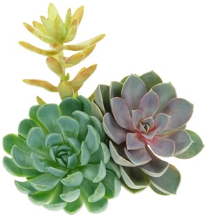 Design notes: Small potted succulent plants are often cut from their roots for use in floral design. They can be wired to picks or extenders for addition to floral arrangements or wreathes. Very small plants can be wired or glued into boutonnieres or corsages. Succulents can add interest and texture to any floral design.