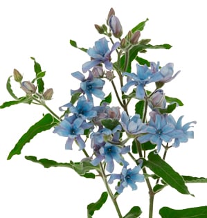 Design notes: These wonderful blossoms with their delicate petals and vivid blue color are a striking addition to a floral design. Tweedia blossoms can be used in arrangements to add mass or as a filler.
