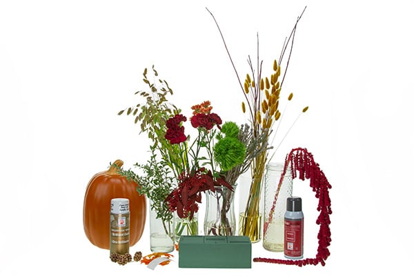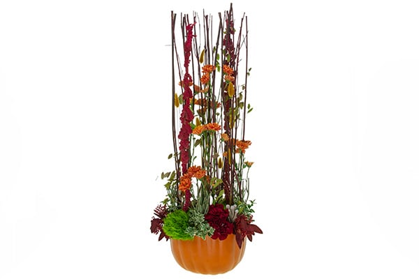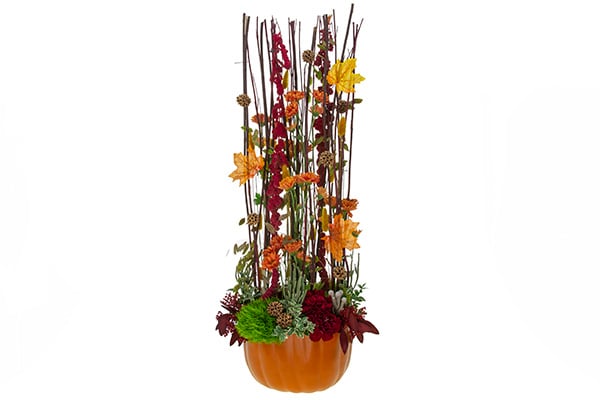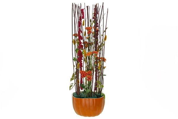 Materials: Hard goods include wet foam, UGlu Adhesive Dashes, Design Master paint “Gold”, Design Master paint “Ubermatte Radish” (red); Faux materials include one 13” Hyde and EEK carvable pumpkin, fall leaves; Foraged and dried materials include dogwood branches, sweet gum tree pods, dried and tinted bunny tails, hanging amaranthus; Fresh materials include spray mums, oat grass, carnations, green trick dianthus, brunia, dyed seeded eucalyptus, and oregonia.