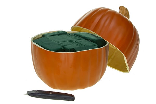 Use a utility knife to carefully slice the carvable pumpkin in half. Then cut one brick of foam to fit snugly inside the pumpkin, leaving enough room on the sides to add water.