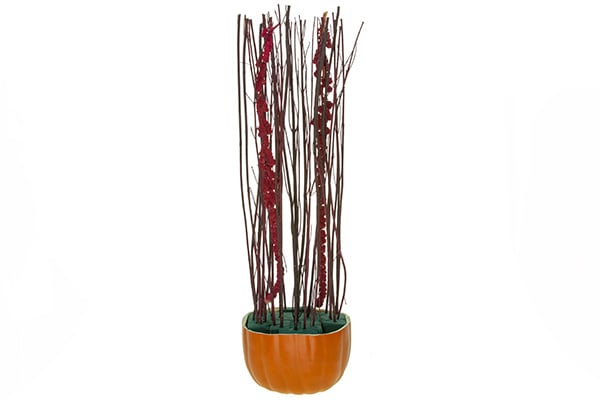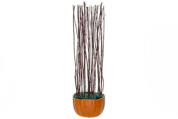 Insert the dogwood branches vertically into the foam using multiple binding points and staying within the width of the pumpkin. Choose the sturdiest branches and place enough of them into the foam to support and stabilize the weight of the pumpkin lid when set on top of the limbs. Cut the tips of the dogwood branches straight across so they are flush and create a level surface for the pumpkin lid to rest securely in place.