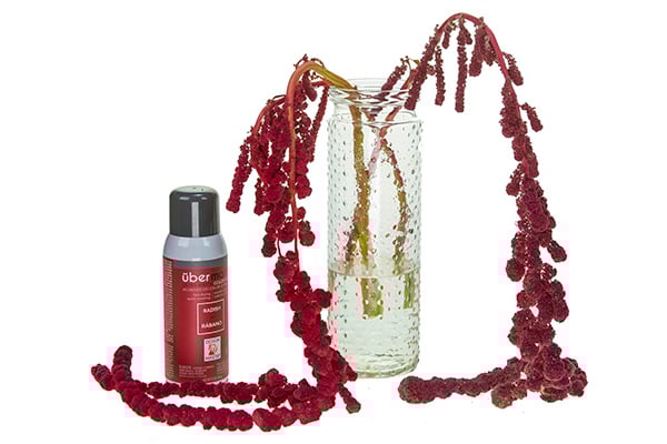 Use Design Master paint “Ubermatte Radish” (red) to shift the color and enhance the vibrancy of the dried hanging amaranthus. Let the paint dry before adding the material to the design.