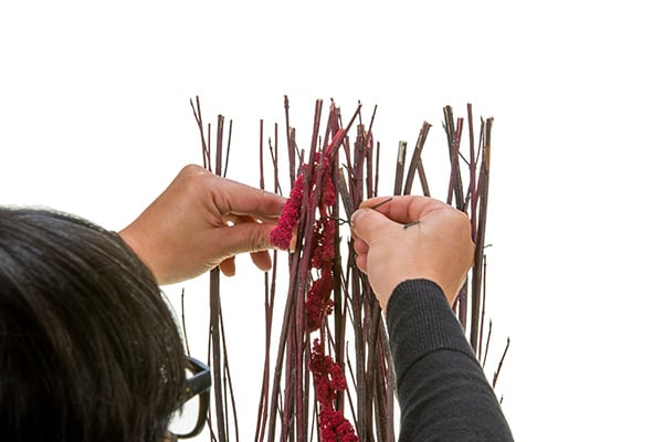 Tie the hanging amaranthus as high as possible to the top of the dogwood. Use bind wire (or any other material on hand) to attach the garlands securely to the branches.