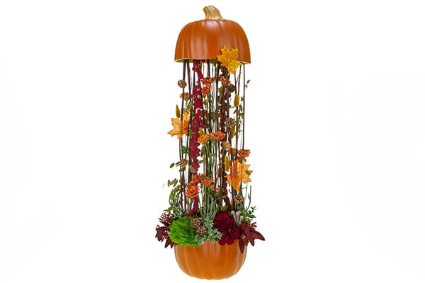 What do you get when Teacher Marisa Perring AIFD and Assistant Creative Director Parker Jenkins collaborate on a floral design? Why a unique and whimsical autumn arrangement of course! The creative result of their collective imagination is a fall design that mixes fresh, foraged and faux materials in a carvable pumpkin, which can be repurposed for any future autumn season or event.