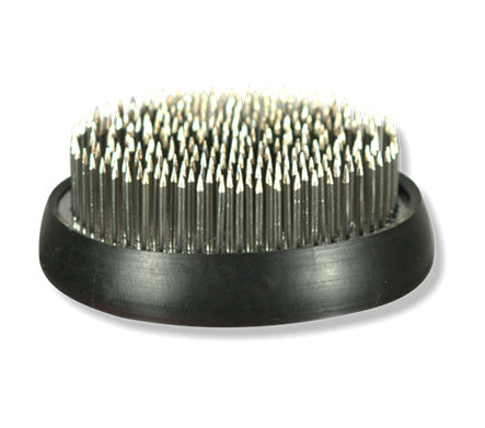 This kenzan consists of a heavy metal base embedded with upright, sharp pins. These pins secure flower and foliage stems in place, holding them at precise angles without the need for floral foam. It allows the designer to insert stems firmly and individually, ensuring control over placement, direction, and spacing.